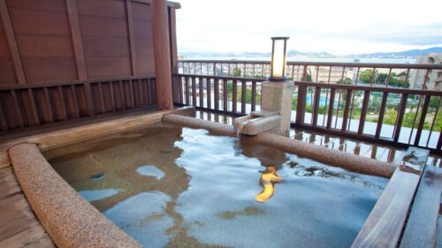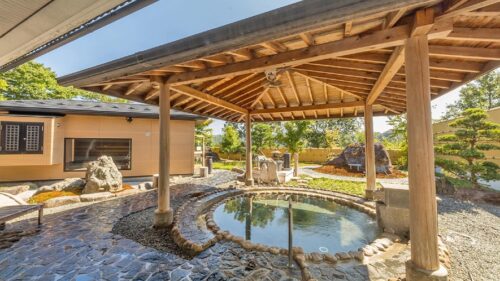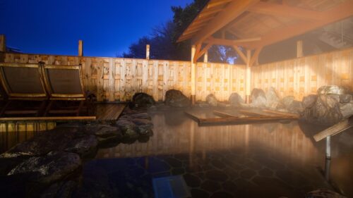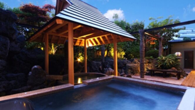 | ▶︎天然温泉大浴場「水明の湯」をはじめ、5つの貸切露天風呂も予約なしで利用可能 |