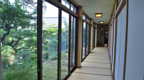 \特別客室の露天風呂と畳敷きの廊下/