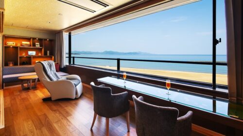 中でも豪華なお部屋「朱₋aka-」は、窓一面に絶景を望むオーシャンフロントの客室で、露天風呂はもちろんマッサージチェアや美顔スチーマーといった特別な設備やサービスが充実!
