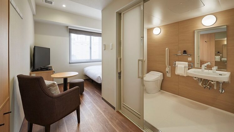 バリアフリー対応ルームは1~2人向けのコンパクトな客室ですが、シャワールームやトイレが広々とした設計になっていて、車椅子での利用に最適です!