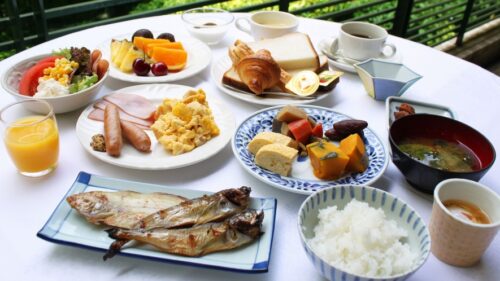 | ▶︎朝食つきプランでは、おばんざいや和洋メニュー豊富なバイキングを提供 |