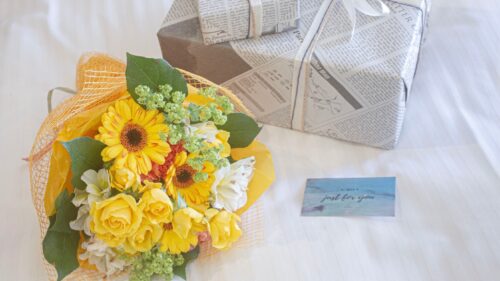 お部屋でのサプライズではタオルを使って飾りつけをしてくれ、パートナーの方とおそろいのタオルハンカチをプレゼントしてくれますよ。