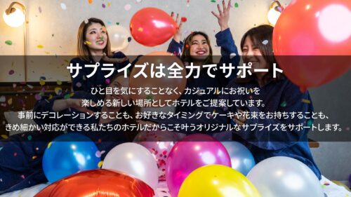 事前入室による飾り付け対応やケーキやシャンパン付きのサプライズプランなど、パートナーやご友人の誕生日や記念日などを特別な日にすることができます。