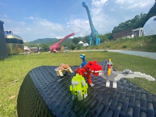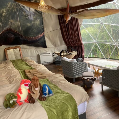 恐竜をテーマにしたテントやオブジェがあり、アウトドア体験と恐竜の世界を一緒に楽しめます。