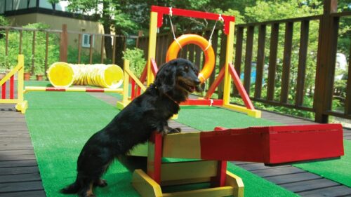 | ▶︎デッキテラスに設置されているアジリティ広場には、ペット用の遊具や足洗い場も整っている |
