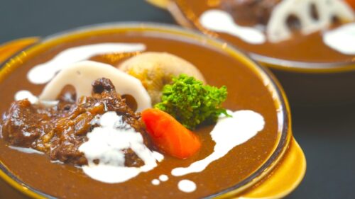 | ▶︎食事つきプランでは、創業から続く秘伝のビーフシチューをはじめ、海の幸たっぷりのコース料理やヘルシー和朝食が味わえる |