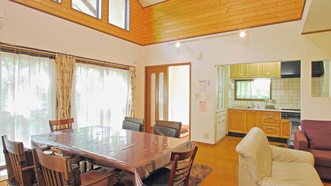 ペンションはペット連れも含めて最大16人が泊まれる広さで、キッチンやダイニング、テラス、客室、内湯など設備が充実しています。
