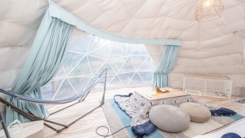 ペットOKのグランピング施設には、ゲージや水飲み皿といったペット用のアイテムをはじめ、ダブルベッドやエアコン常備で快適性も抜群!バーベキューハウスも併設され、ペットと一緒に食事が楽しめます。
