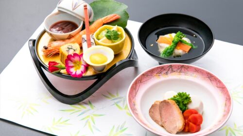 | ▶︎板長が市場で買い付けた旬の食材を使った会席膳をお部屋食で! |