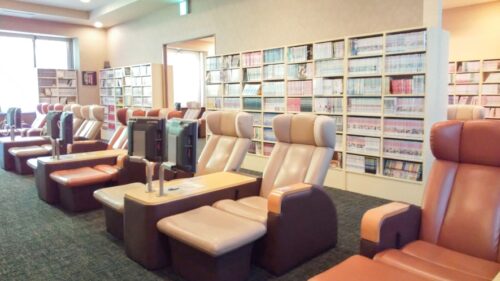 リラクゼーションエリアでは漫画や雑誌、マッサージチェアなどでリラックスできます。