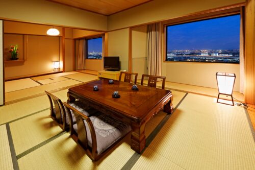 和室12.5畳(川側)の広々とした客室は、家族みんなでゆったり過ごせて、赤ちゃん連れにも安心。ベッドと違って転落の心配がないから、小さなお子様がいても安心して休めますね。