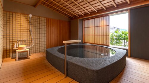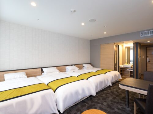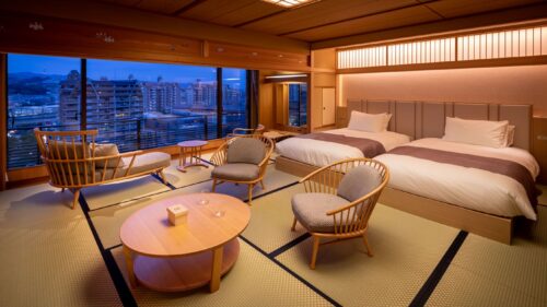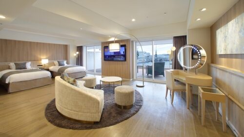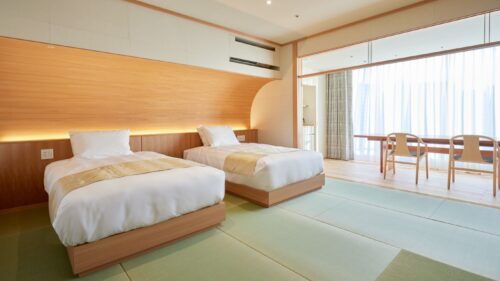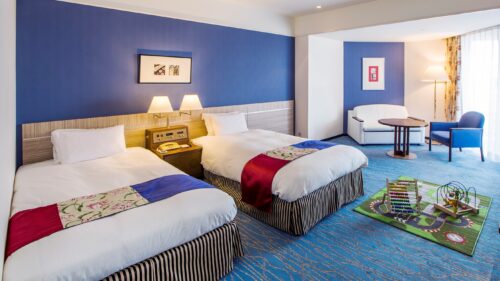 注目は1室限定のファミリー和洋室(77.1㎡)!和室10畳+ツインベッドルームで最大5名まで宿泊でき、キッズプレイルーム付き、洗い場付きバスルームと子連れに嬉しい設備が完璧に揃っています。