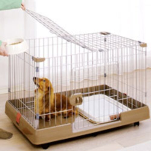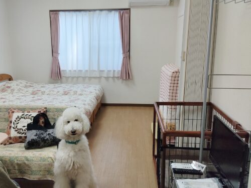 - ペット用ケージ 90cm×60cm、トイレシート、ご飯と水の小皿はお部屋に完備されている。