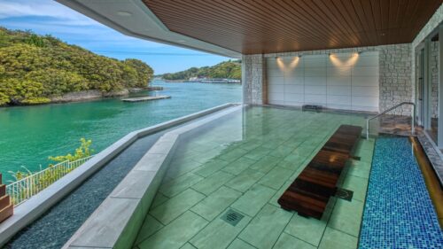 離れには水着着用で入る貸切風呂も完備され、目の前に広がる英虞湾の景色とともに温泉が満喫できますよ。