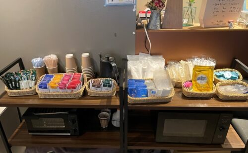 | ▶︎シェアラウンジでは、ドリンクバー・スナックや書籍、ボードゲームなどが楽しめる |