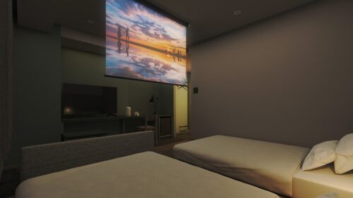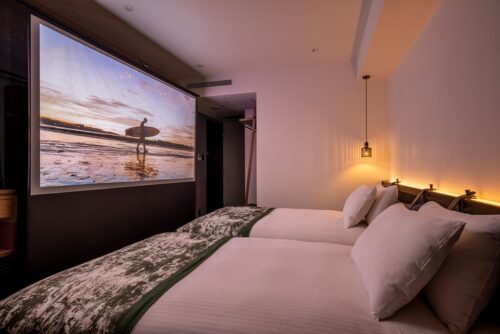 それぞれのホテルや宿泊施設に大画面プロジェクターが完備され、一人またはグループで映画やライブ映像、動画配信サービスが楽しめます。