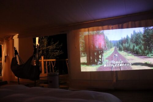 大型コットンテントのお部屋には、プロジェクターとスピーカーが常設されているので、プライベートなシアターホテルとして映画や好きな作品が鑑賞できるメリットも!