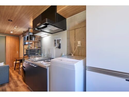 | ▶︎ワークスペース・キッチン・冷蔵庫・電子レンジ・洗濯機・洗濯物干し・食器といった、長期滞在に適した設備が充実 |