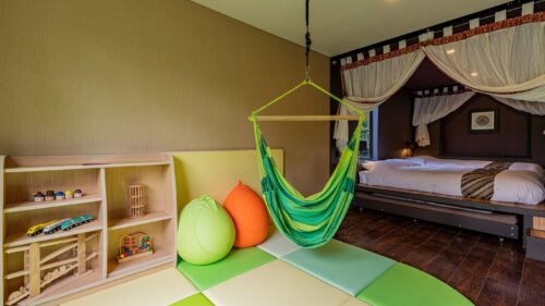 6名まで泊まれるパノラマプレミアファミリールームには、キッズテントやハンモックなど、子どもがワクワクする仕掛けが満載です!