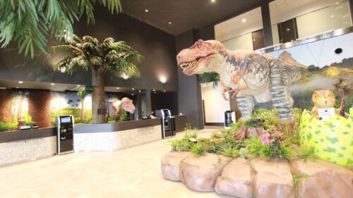 フロントでは恐竜ロボットが出迎えてくれて、子ども達もびっくり!